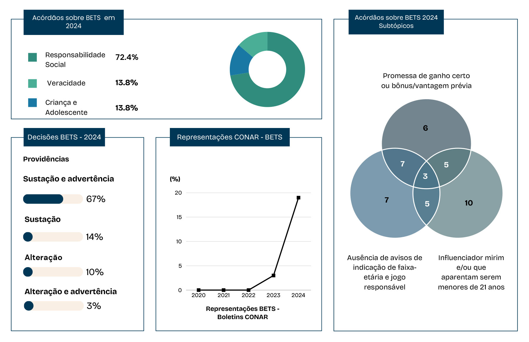 Adicionalmente, os dados apontam um crescimento expressivo no número de representações de 2022 a 2024, o que demonstra uma maior vigilância institucional e social sobre as práticas de comunicação no setor de apostas, consolidando um cenário regulatório mais exigente.