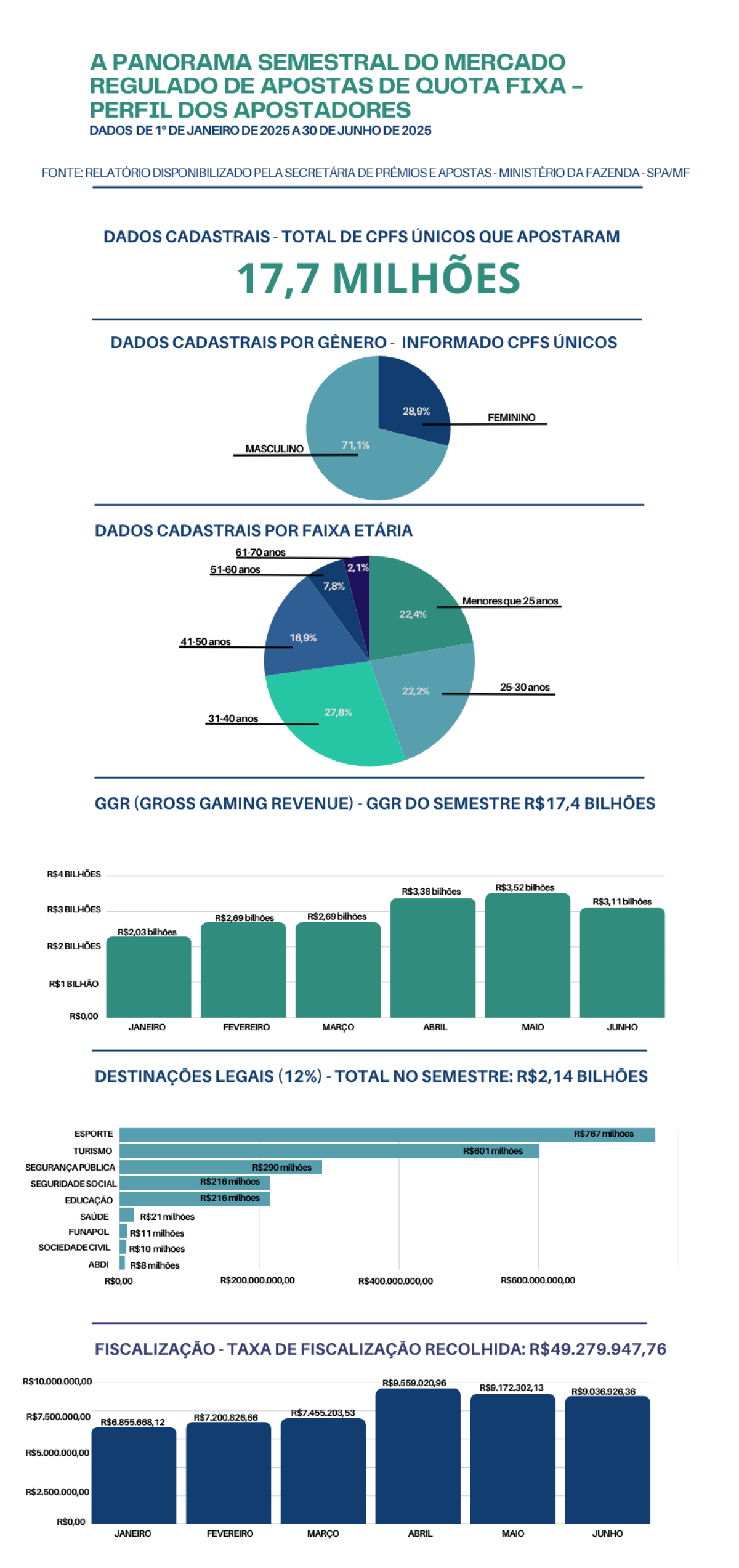 Os números retratam o desempenho do setor entre 1º de janeiro e 30 de junho de 2025, incluindo o perfil dos apostadores, a arrecadação total (GGR de R$ 17,4 bilhões), a distribuição das destinações legais (R$ 2,14 bilhões), as ações de fiscalização e combate a irregularidades, e as iniciativas voltadas ao jogo responsável e à integridade do mercado.